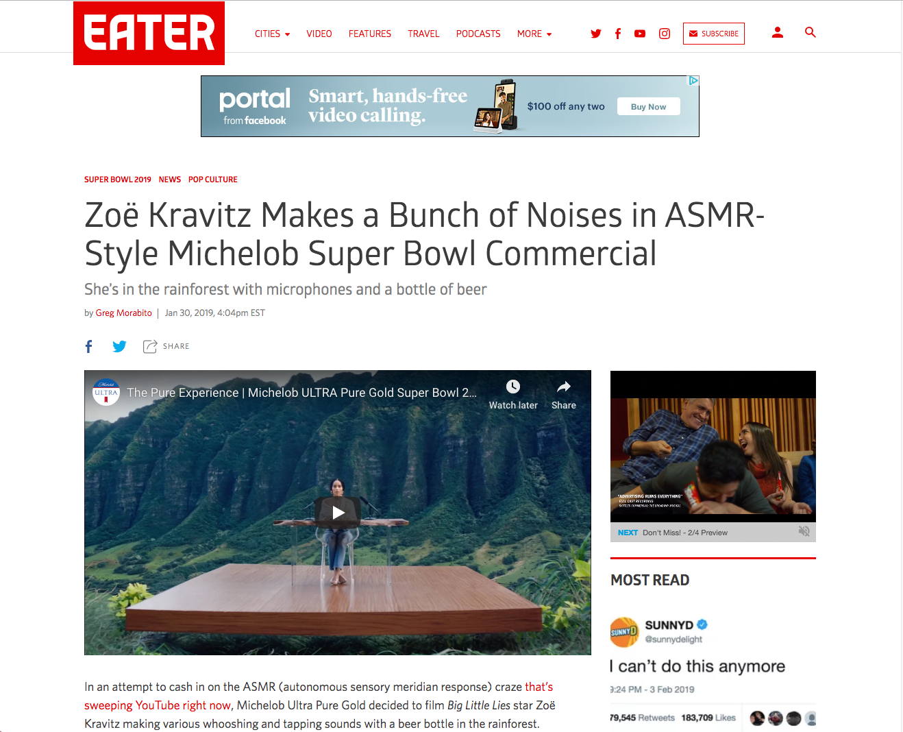 A 2019 Super Bowl film starring Zoë Kravitz that disrupts the most chaotic event with a whisper. Using ASMR, a sensorial, meditative technique meant to soothe the listener, Zoë calmly delivers the organic product’s key benefits while introducing a niche, natural therapy to hundreds of millions of viewers.